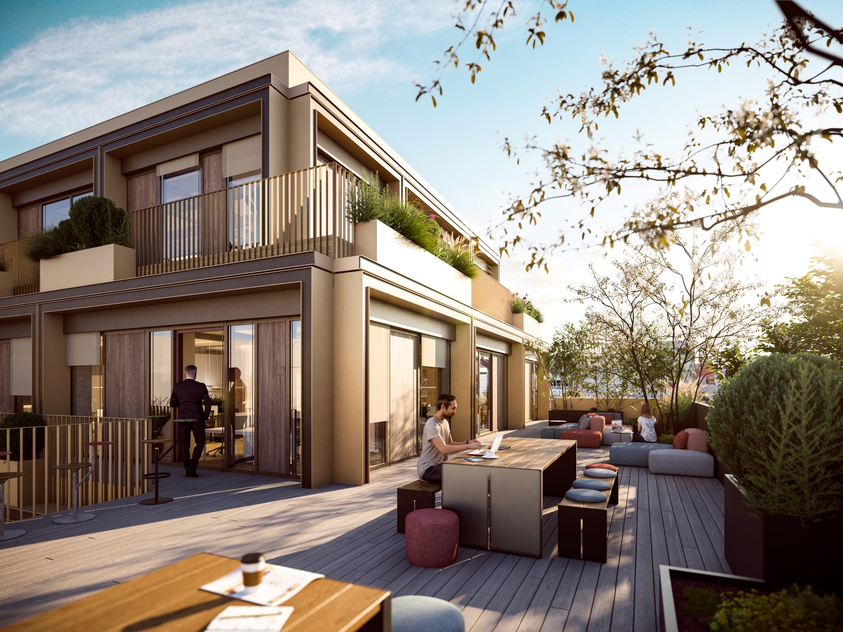 Mitten in der Stadt wird das FMQ zum Biotop für Fokus und Erholung: Begrünte Innenhöfe, üppige Freiflächen und großzügige Dachterrassen schaffen eine unvergleichliche Arbeitsatmosphäre. Hier atmet die Stadt – und man selbst gleich mit. Eine Oase, die nicht nur entschleunigt, sondern auch motiviert.